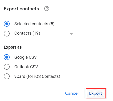 Go to Google Contacts, select the contacts you desire to export, and click Export from the vertical ellipsis menu.